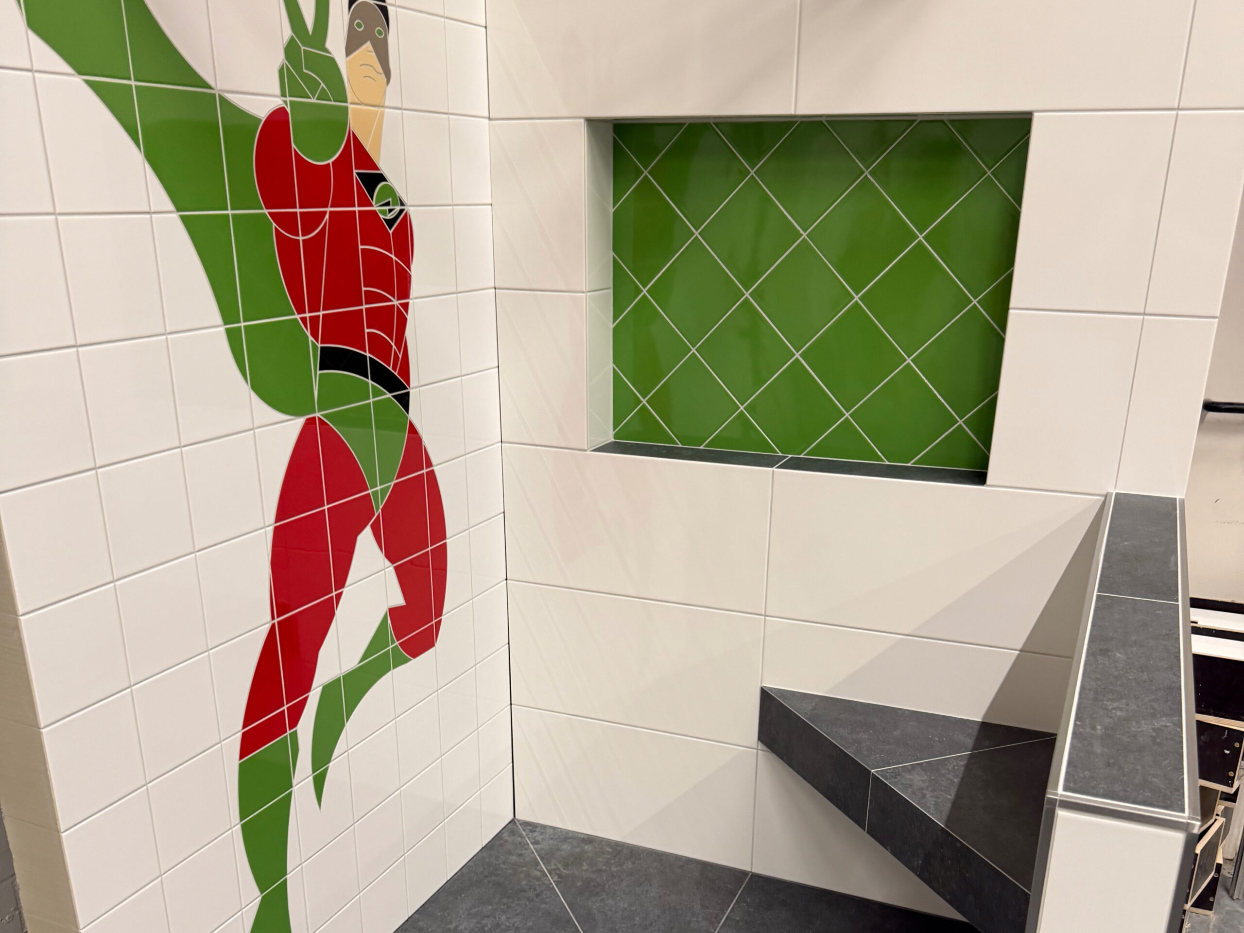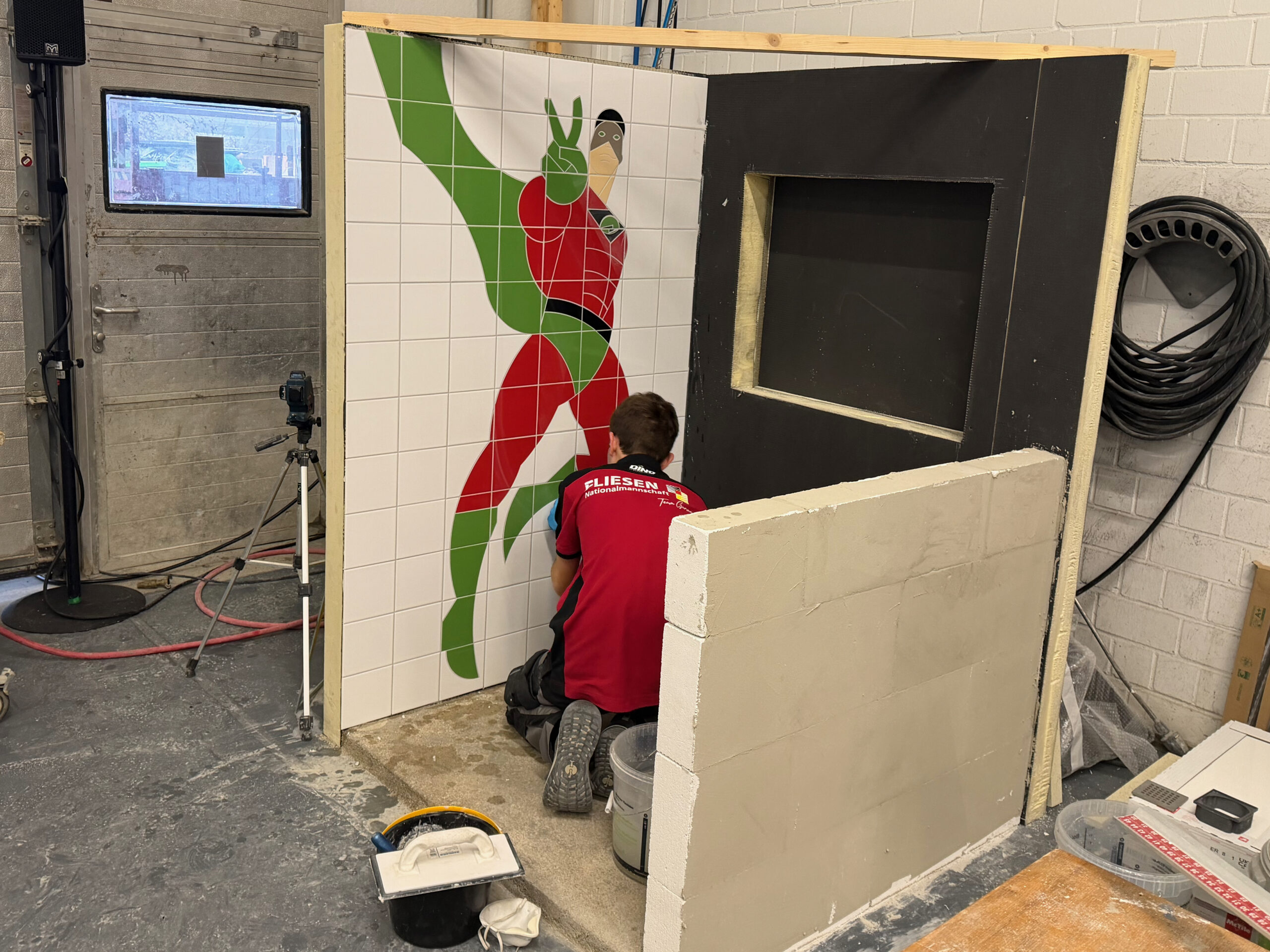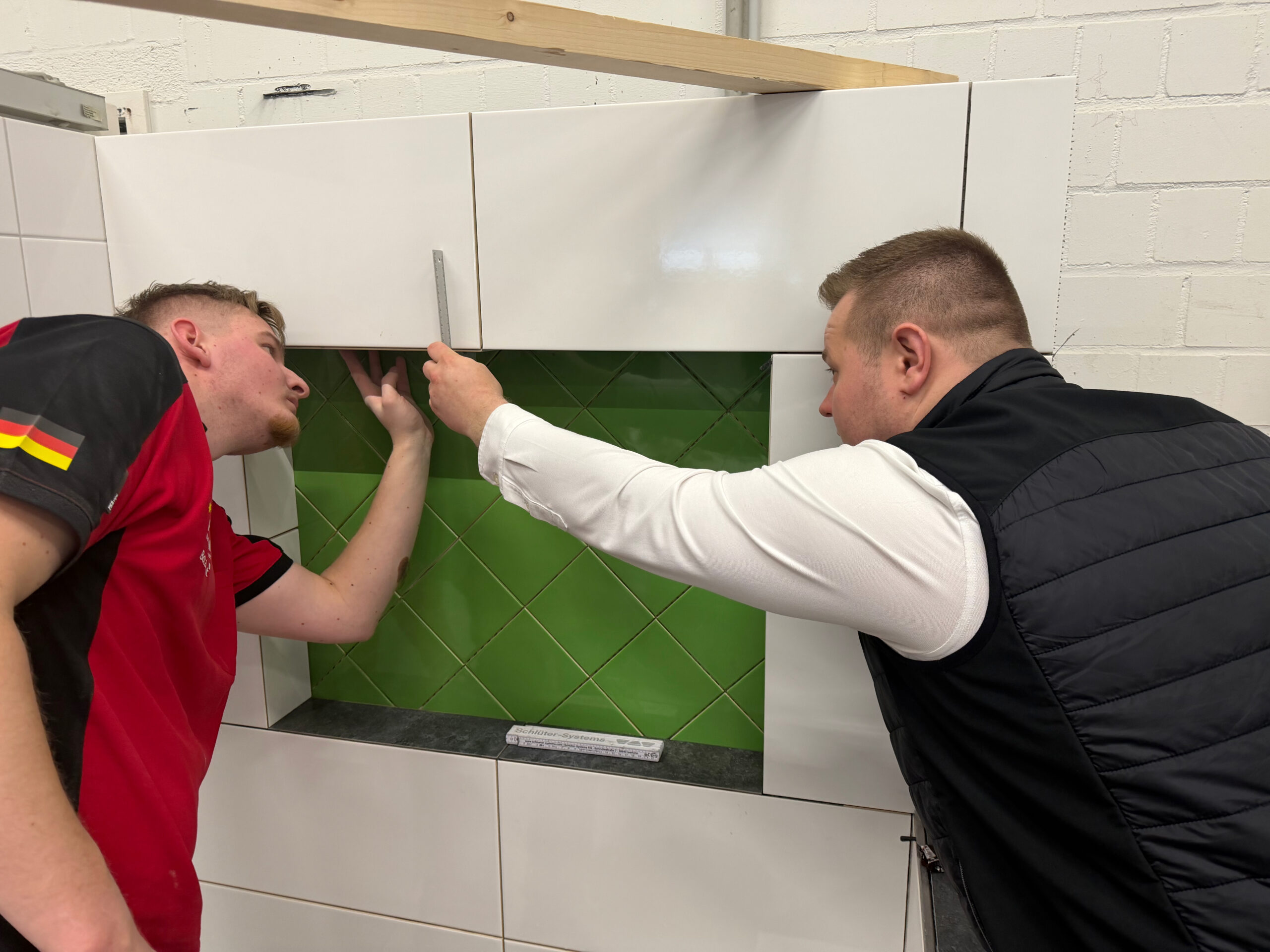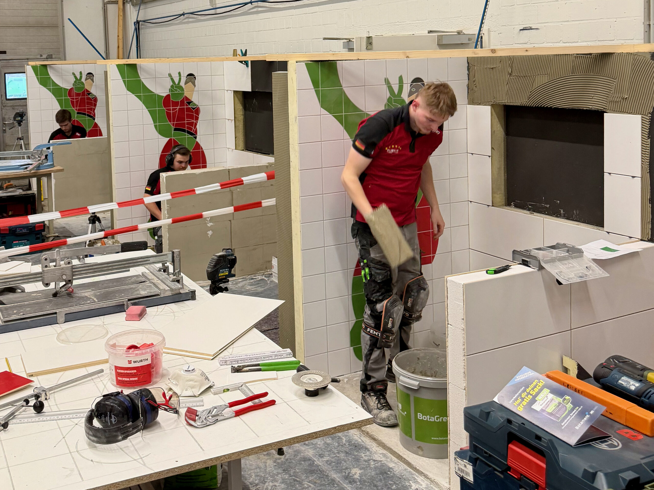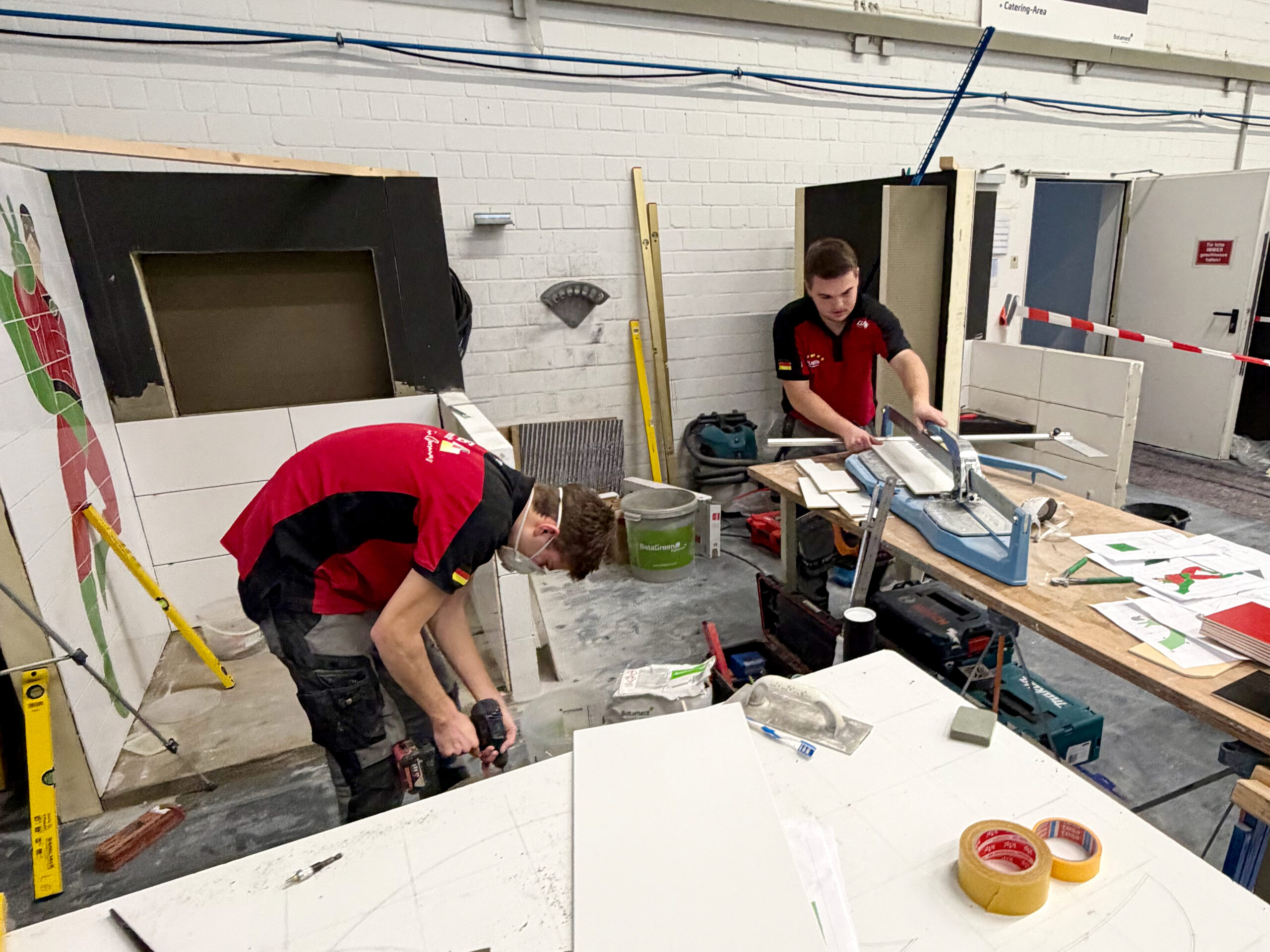 Ein Zeitkontingent von insgesamt 22 Stunden bekam das Team, um eine komplette Duschecke anzufertigen. Die erste Teilaufgabe bestand in der Gestaltung der linken Wand, auf der eine Botament-Werbefigur gefliest werden sollte: der Green Hero. In der rechten Wandfläche erstellten die Teammitglieder eine Nische, deren Rückwand sie mit diagonal verlegten Fliesen gestalteten. Innerhalb der vorgegebenen Zeit bauten sie zudem eine Schamwand, an deren Kanten Schutzschienen angebracht werden mussten. „Eine weitere Herausforderung stellte der Fußboden dar, auf den Gefälleestrich aufgebracht und ein Punktablauf installiert werden sollte.“ Daher mussten die Bodenfliesen komplett aufgeschnitten und abschließend in Trapezform verlegt werden. „Wir haben Qualitätsunterschiede festgestellt, das war jedoch zu erwarten“, erklärt Bundestrainer Marcel Beyer. „Niko Schleicher und Luis Brauner sind in ihrer dritten Wettkampfsaison – sie haben in den vielen absolvierten Trainingseinheiten umfangreiche Erfahrungen sammeln können, von denen die Beiden jetzt profitieren.“