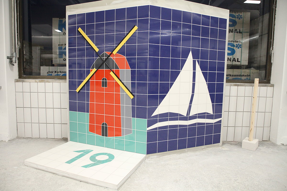 Die Fliesenleger mussten zunächst den Rohkörper ihres Werkstücks aufmauern. Passend zum Veranstaltungsort Bad Zwischenahn war im Fliesenspiegel eine Mühle und ein Segelschiff abzubilden. Vor der linken Wandflächenhälfte waren auf einer zu erstellenden Unterkonstruktion Bodenfliesen zu verlegen und die Jahreszahl einzuarbeiten. Die Wettbewerbsaufgabe galt als anspruchsvoll mit vielen Rund-, Schräg- und Diagonalschnitten.