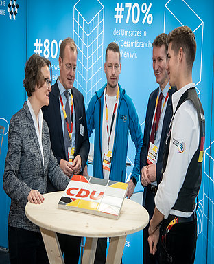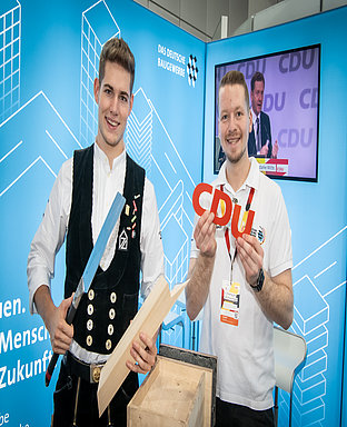 Am 22. und 23. November 2019 fand in Leipzig der 32. Parteitag der CDU Deutschlands statt. Der ZDB war vor Ort, um für die Interessen der Baubranche zu werben. Unterstützung erhielten wir von den frisch gekürten Weltmeistern Alexander Bruns (Zimmerer) und Janis Gentner (Fliesenleger). Viele Parlamentarier, Bundesminister, Staatssekretäre und weitere hochrangige Politiker fanden den Weg zu unserem Stand.