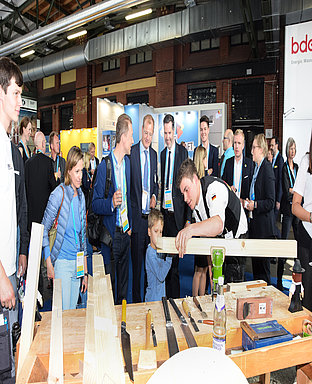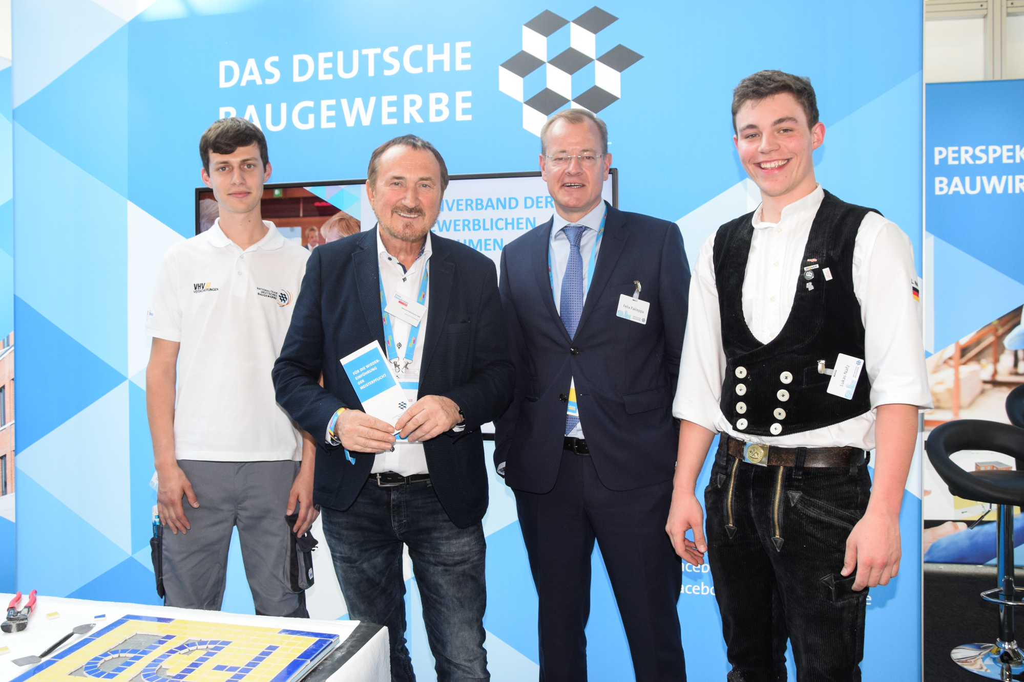 Am Ausstellungsstand des ZDB aktiv waren auch Lukas Nafz, Deutscher Meister 2017 der Zimmerer und Mitglied der Zimmerer-Nationalmannschaft, und Cedrik Knöpfle, Deutscher Meister 2016 der Fliesenleger und Mitglied im Nationalteam Deutsches Baugewerbe. Die jungen Handwerksgesellen demonstrierten ihr Können und stellten so die Qualität des Ausbildungswesens in den Bauberufen unter Beweis. Zahlreiche Politiker, darunter auch der Vorsitzende der Freien Demokraten Christian Lindner, zeigten sich von ihrem Potenzial beeindruckt und interessierten sich für die Anliegen des Baugewerbes.