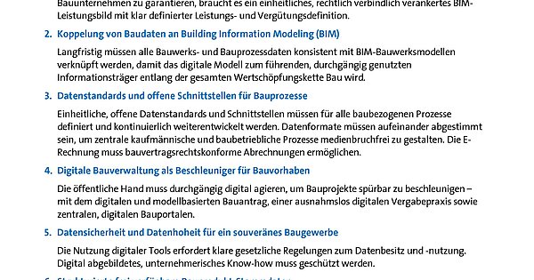 Das Baugewerbe befindet sich in der digitalen Transformation. Als Schlüsselbranche für die Umsetzung öffentlicher, gewerblicher und privater Bauprojekte des Wohnungs-, Wirtschafts- und Infrastrukturbaus ist sie auf leistungsfähige digitale Rahmenbedingungen angewiesen. Daher fordern wir: