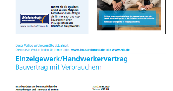 Der Einzelgewerk/Handwerkervertrag (Bauvertrag mit Verbrauchern) kann sowohl für die Beauftragung von Handwerkerleistungen, wie beispielsweise Zimmererarbeiten, Fassadenarbeiten oder Fliesenarbeiten, als auch für die Beauftragung von Einzelgewerken zur Errichtung eines Ein- oder Mehrfamilienhauses verwendet werden.
