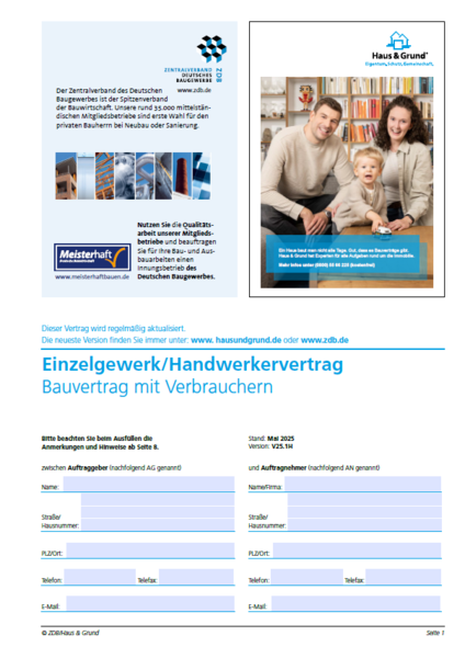 Zur Verfügung stehen ein Einzelgewerk/Handwerkervertrag (Bauvertrag mit Verbrauchern), der sowohl für die Beauftragung von Handwerkerleistungen, wie beispielsweise Zimmererarbeiten, Fassadenarbeiten oder Fliesenarbeiten, als auch für die Beauftragung von Einzelgewerken zur Errichtung eines Ein- oder Mehrfamilienhauses verwendet werden kann.